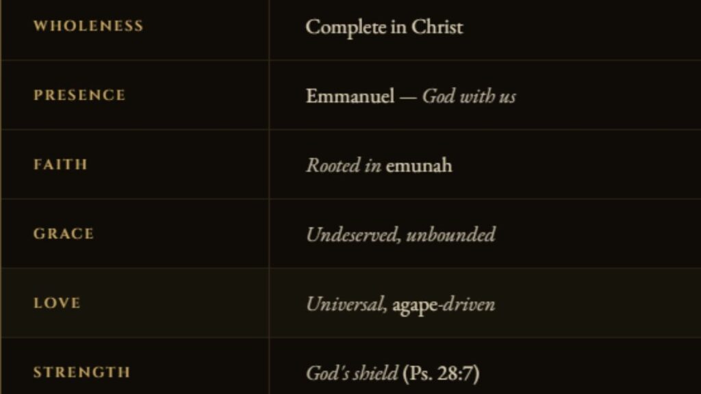 | Hebrew resonance | Shalom (wholeness-peace), Emunah (faithful trust) |